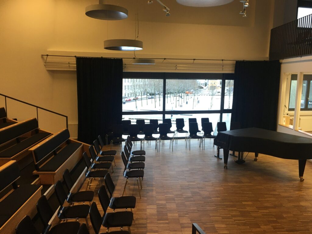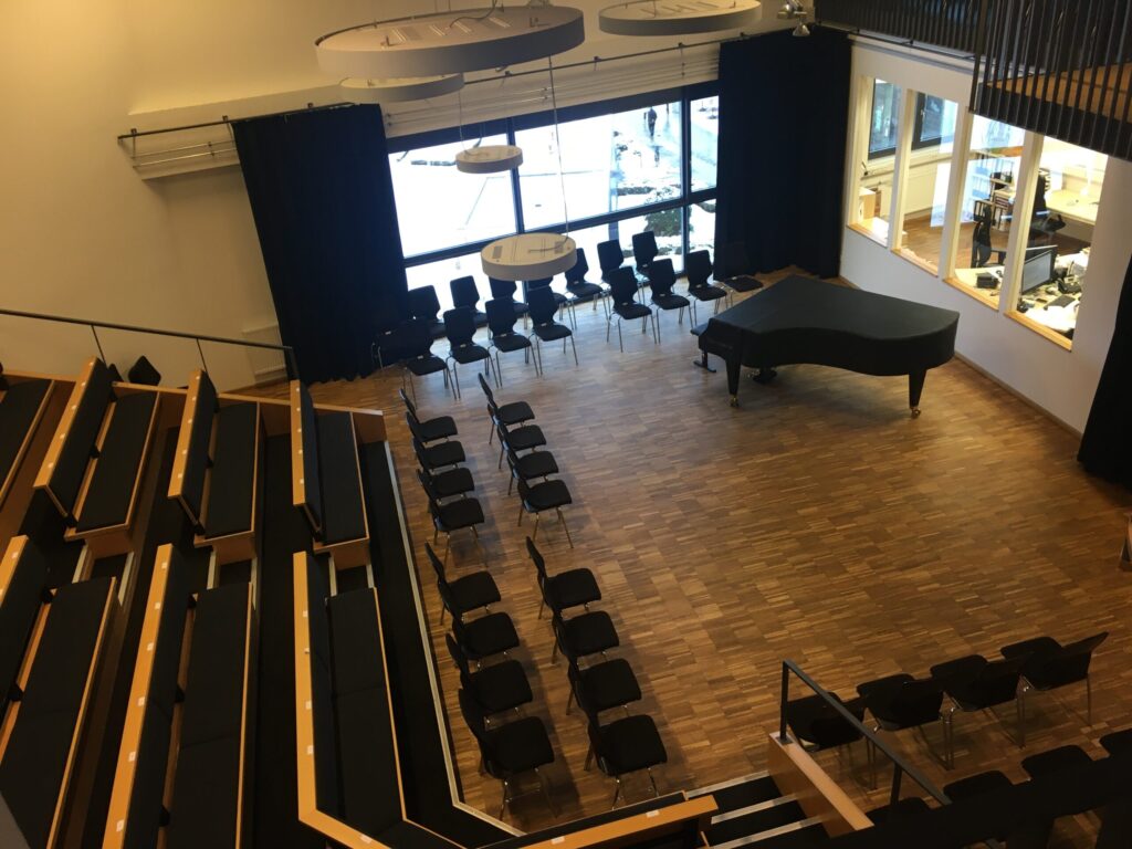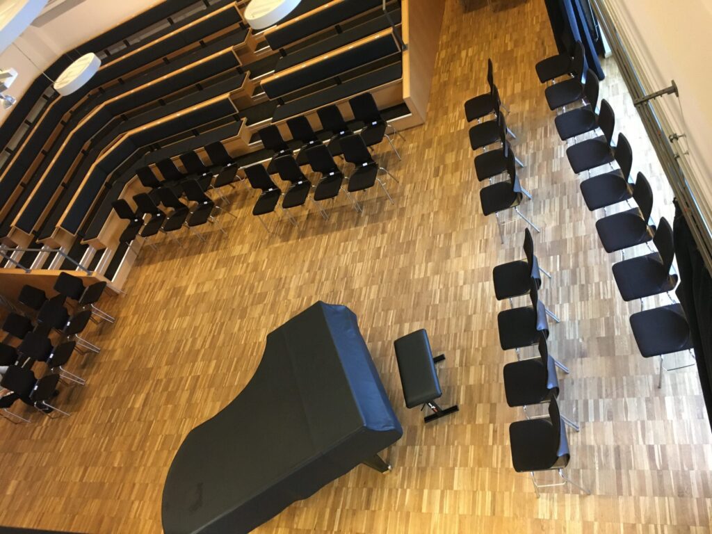 Die fest eingebaute Tribüne bietet Platz für bis zu 85 Personen sowie hervorragende Sicht- und Hörverhältnisse. Durch weitere Zusatzbestuhlung finden im Saal bis max. 141 Personen Platz. Auf der Empore über der Bühne sind weitere 20 Hörplätze verfügbar. Über den Aufzug im Gebäude ist der Konzertsaal auch für Rollstuhlfahrer leicht zugänglich.